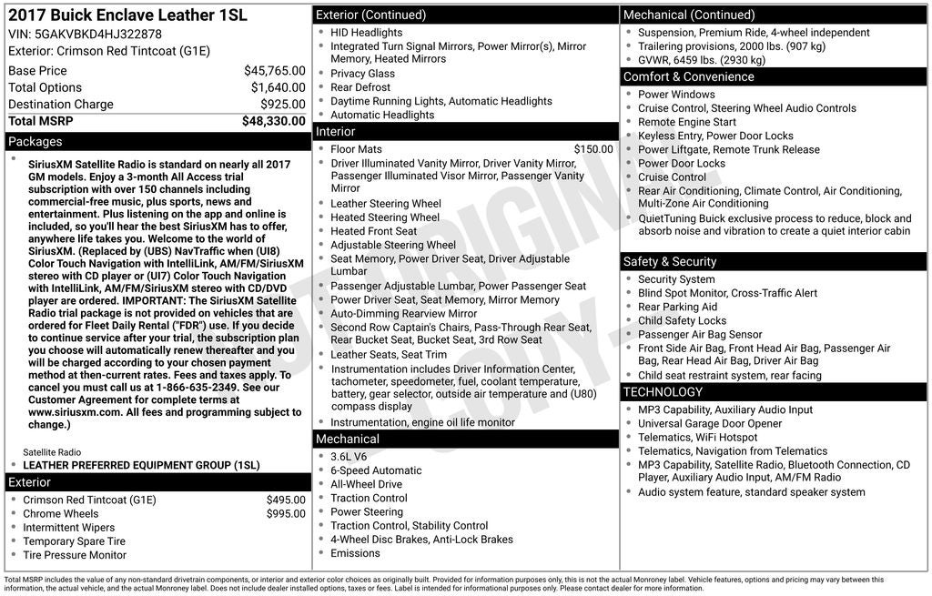 - SiriusXM Satellite Radio is standard on nearly all 2017 GM models. Enjoy a 3-month All Access trial subscription with over 150 channels including commercial-free music, plus sports, news and entertainment. Plus listening on the app and online is included, so you'll hear the best SiriusXM has to offer, anywhere life takes you. Welcome to the world of SiriusXM. (Replaced by (UBS) NavTraffic when (UI8) Color Touch Navigation with IntelliLink, AM/FM/SiriusXM stereo with CD player or (UI7) Color Touch Navigation with IntelliLink, AM/FM/SiriusXM stereo with CD/DVD player are ordered. IMPORTANT: The SiriusXM Satellite Radio trial package is not provided on vehicles that are ordered for Fleet Daily Rental ("FDR") use. If you decide to continue service after your trial, the subscription plan you choose will automatically renew thereafter and you will be charged according to your chosen payment method at then-current rates. Fees and taxes apply. To cancel you must call us at 1-866-635-2349. See our Customer Agreement for complete terms at www.siriusxm.com. All fees and programming subject to change.)