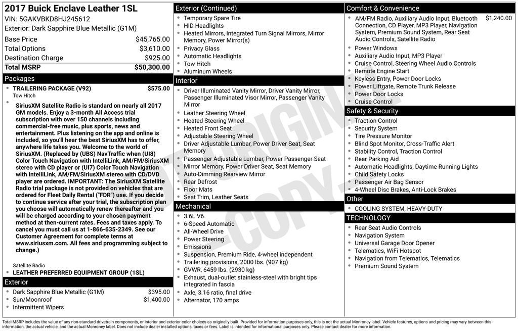 Don't miss your chance to experience the exceptional craftsmanship and versatility of the 2017 Buick Enclave Leather Group. Visit our showroom today and let us demonstrate how this remarkable SUV can enhance your driving experience.
