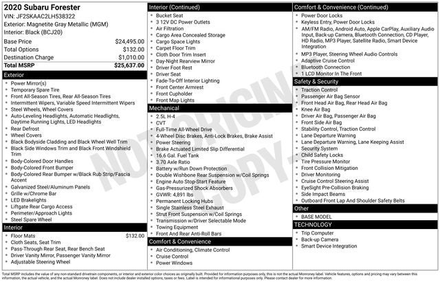 Whether you're commuting to work, embarking on a weekend getaway, or tackling your next outdoor adventure, the 2020 Subaru Forester Base is the perfect blend of capability, comfort, and cutting-edge technology. Experience the confidence and convenience that this exceptional SUV has to offer. Visit our showroom today and let us demonstrate how the Forester Base can enhance your driving experience.