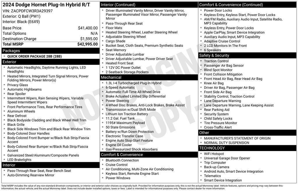 The heart of the Hornet R/T is a powerful 1.3L I4 engine, paired with a smooth-shifting 6-speed automatic transmission and all-wheel drive. This dynamic powertrain delivers an exhilarating driving experience, blending responsive acceleration with impressive efficiency.